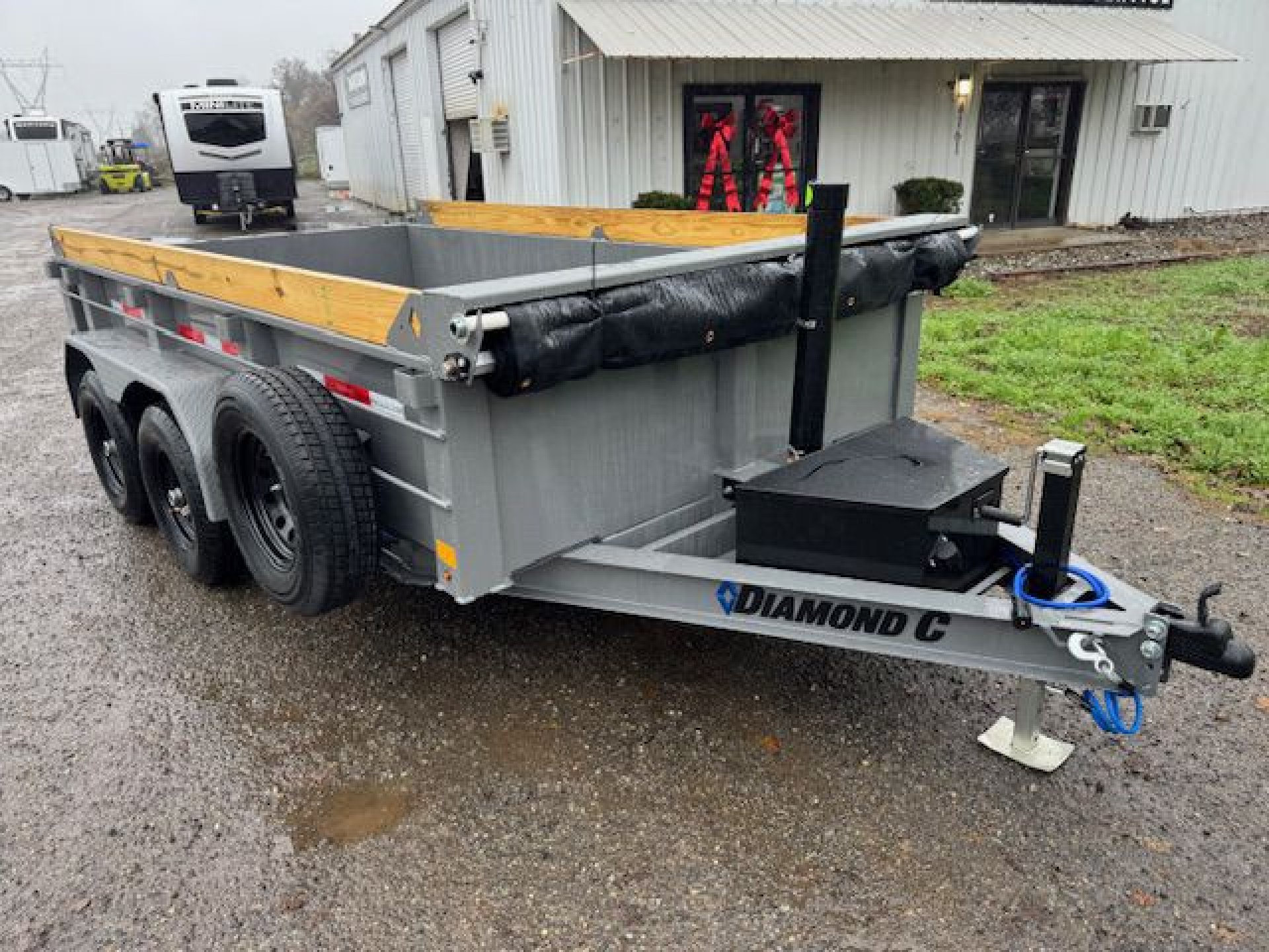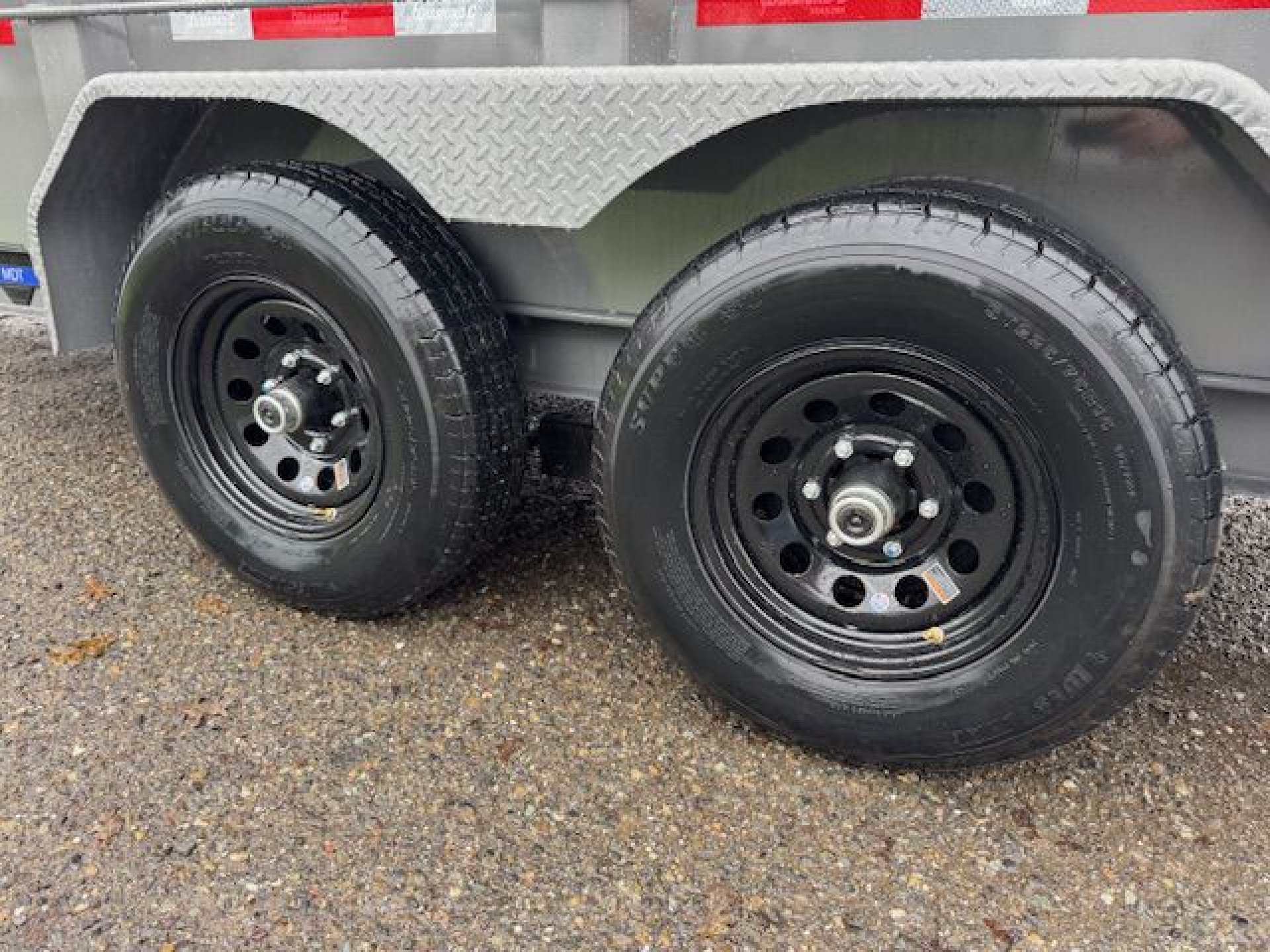 FRAME SIZE, L12X77 AXLE, 2 - 6K DROP 2 ELECTRIC BRAKES SUSPENSION, 5-LEAF SLIPPER SPRINGS JACK, 7K DROP LEG JACK THREE STAGE TELESCOPIC CYLINDER HYDRAULIC SYSTEM, POWER UP, GRAVITY DOWN CROSS MEMBERS, 3" I-BEAM ON 16" CENTERS DUMP BODY FRAME, 3" X 2" 11GA RECTANGLE TUBE COUPLER, 2-5/16", 21K DEMCO EZ-LATCH (ADJ CHANNEL) TONGUE/FRAME, 6" X 8.5 LB I-BEAM STORAGE, STEEL HYDRAULIC PUMP BOX SPAREMOUNT - PASSENGER (CURB) SIDE GATE, 3-WAY DUMP GATE (STANDARD) RAMPS, 60" REAR SLIDE-IN (2" SQUARE TUBE) SIDES, 24" TALL, 12GA INTEGRAL W/ FLOOR (L12) BOARD BRACKETS W/BOARDS & RAISED FRONT FENDER, 14 GA TEARDROP, DIAMOND PLATE, WELD-ON BATTERY - GROUP 27 TIE DOWN, STANDARD 1/2" D-RINGS (4 TOTAL) TIRES, ST225/75R15 RADIAL 6 HOLE BLACK SPARE, ST225/75R15 RADIAL 6 HOLE BLACK PAINT, CEMENT GRAY LIGHTS, ALL LED TARP, 18' HEAVY DUTY, BLACK MESH (INSTALLED