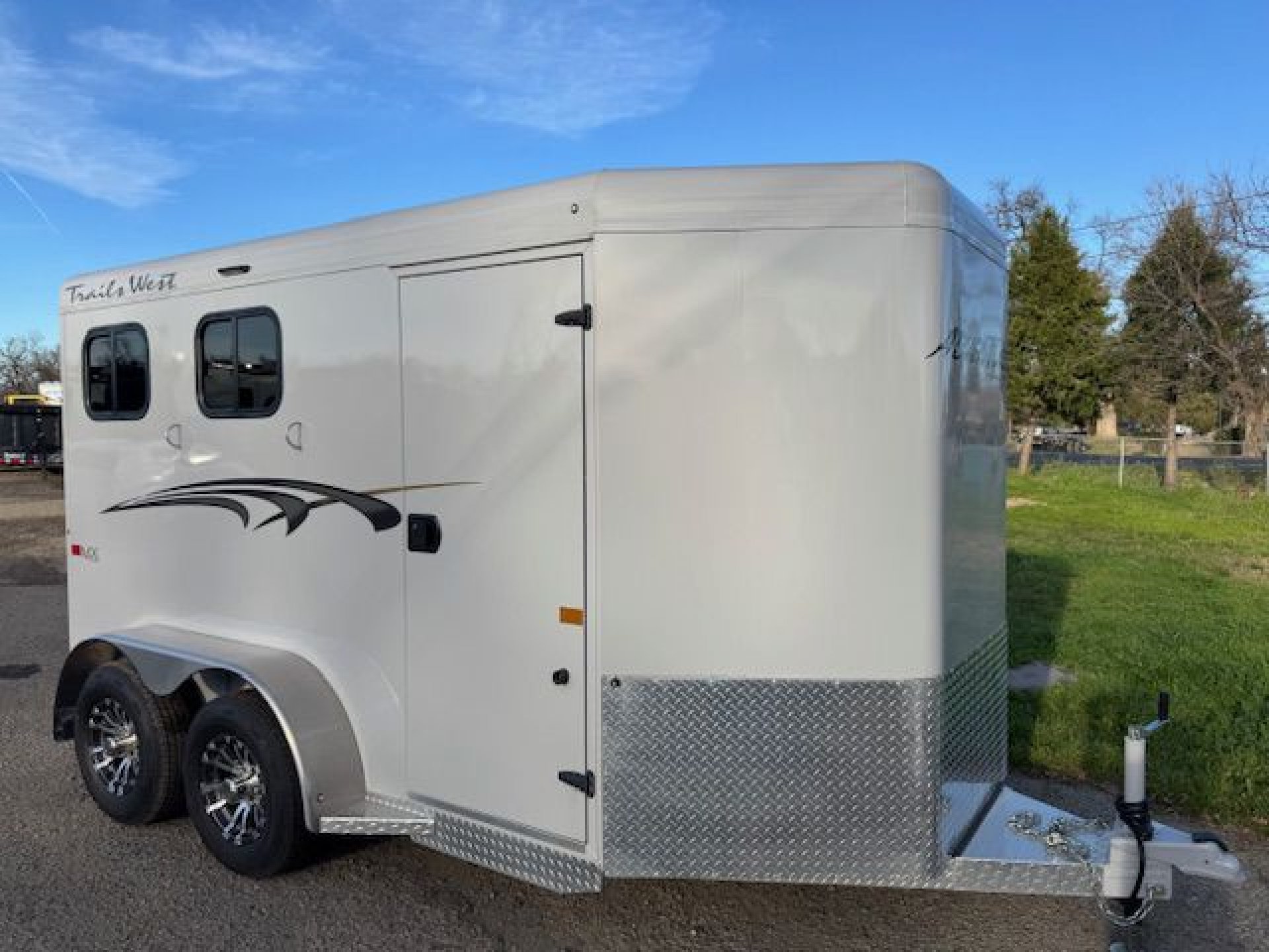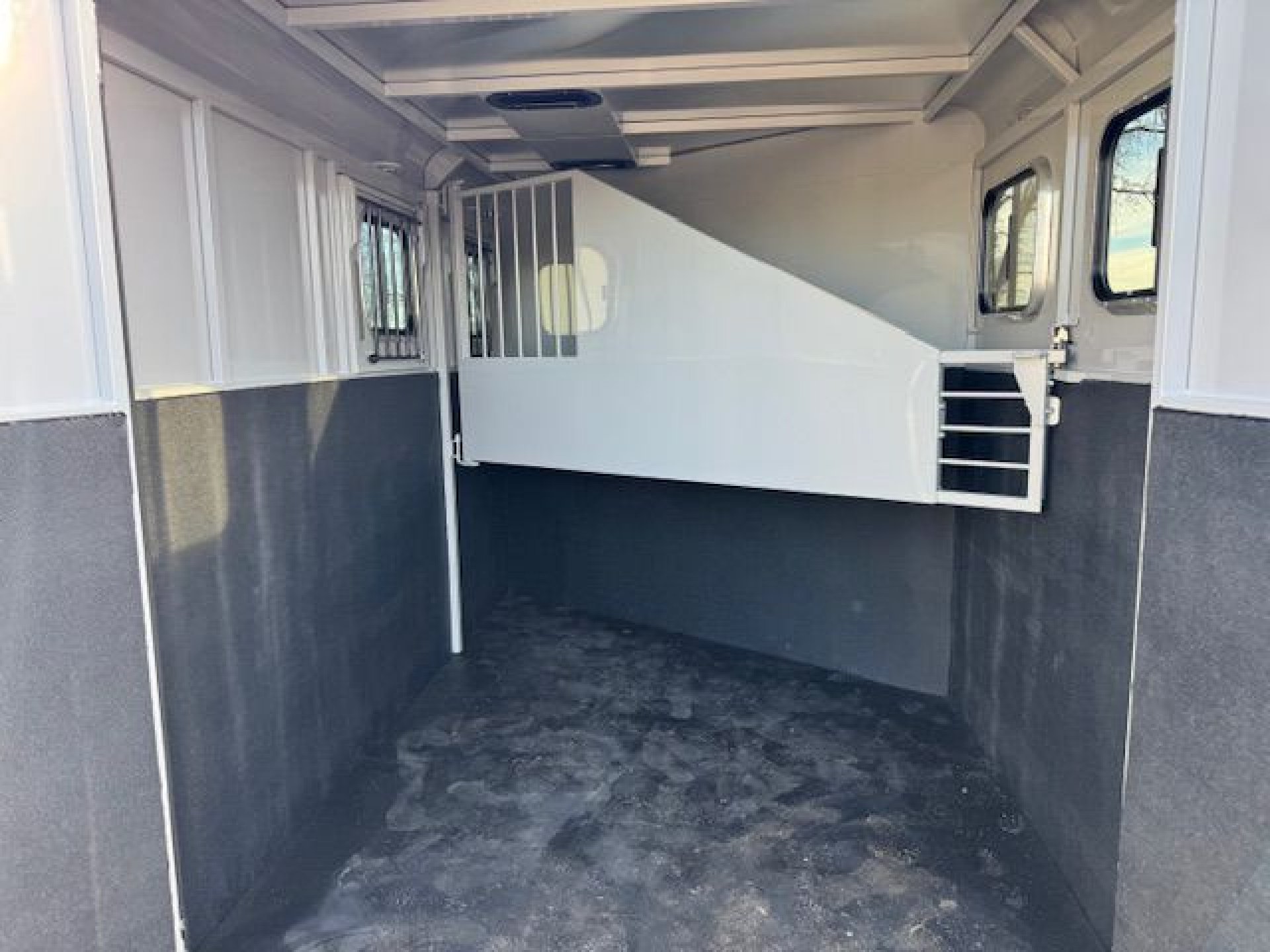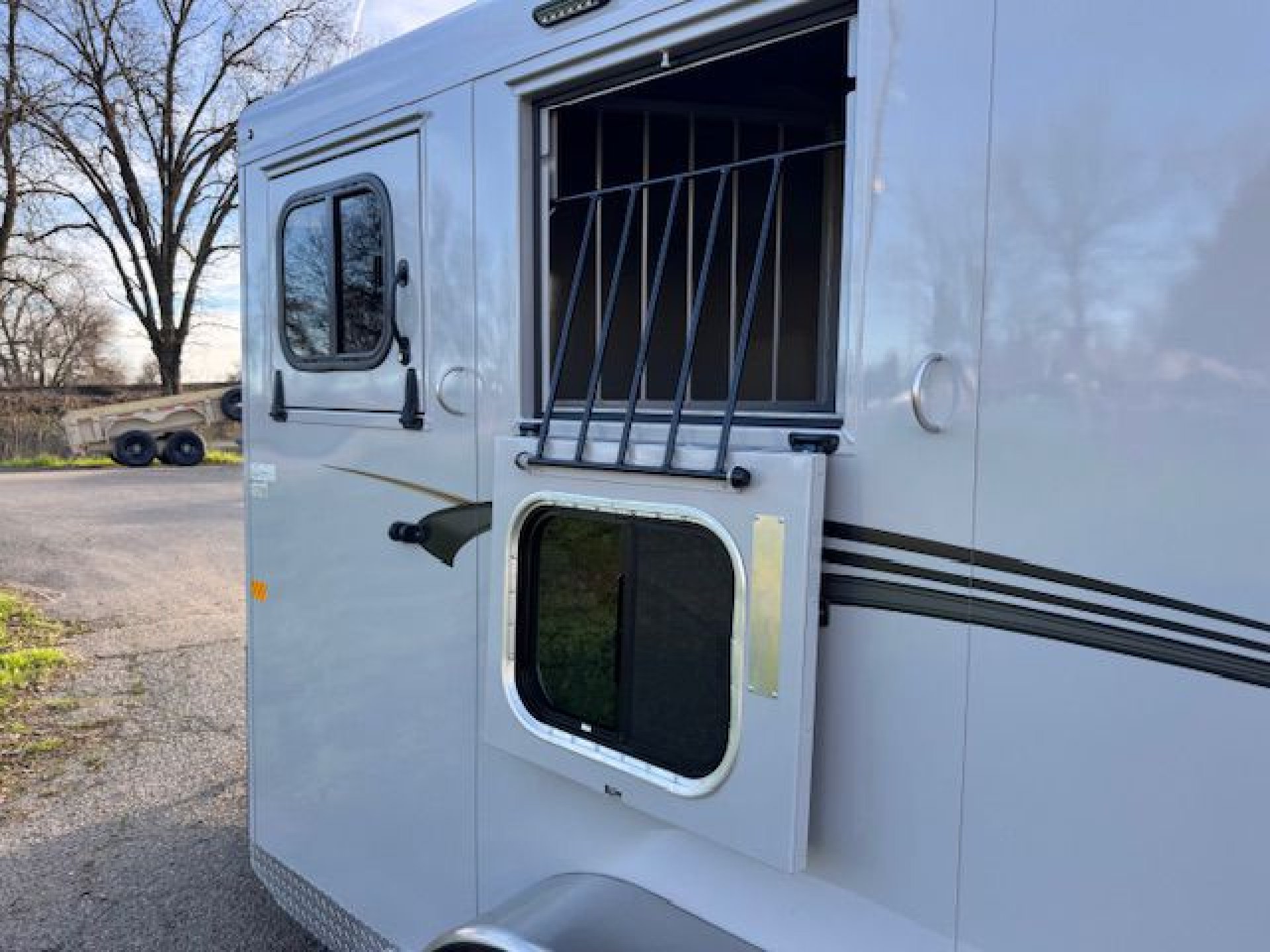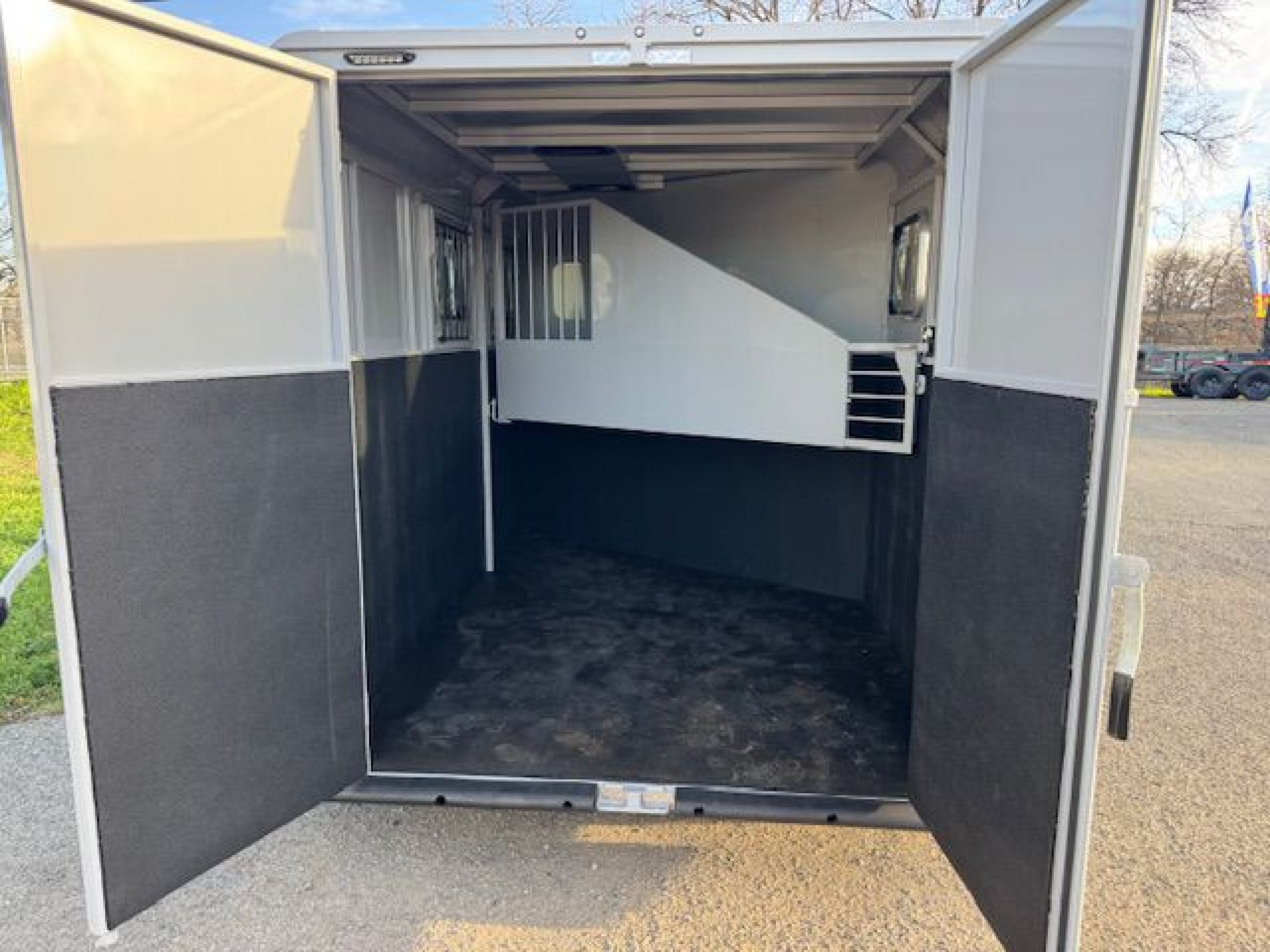 Bumper pull horse trailer with tack room. Fully enclosed horse compartment with drop down feed windows head side, tail side windows and roof vents in each stall. Rubber floor mats and wall matts are standard.