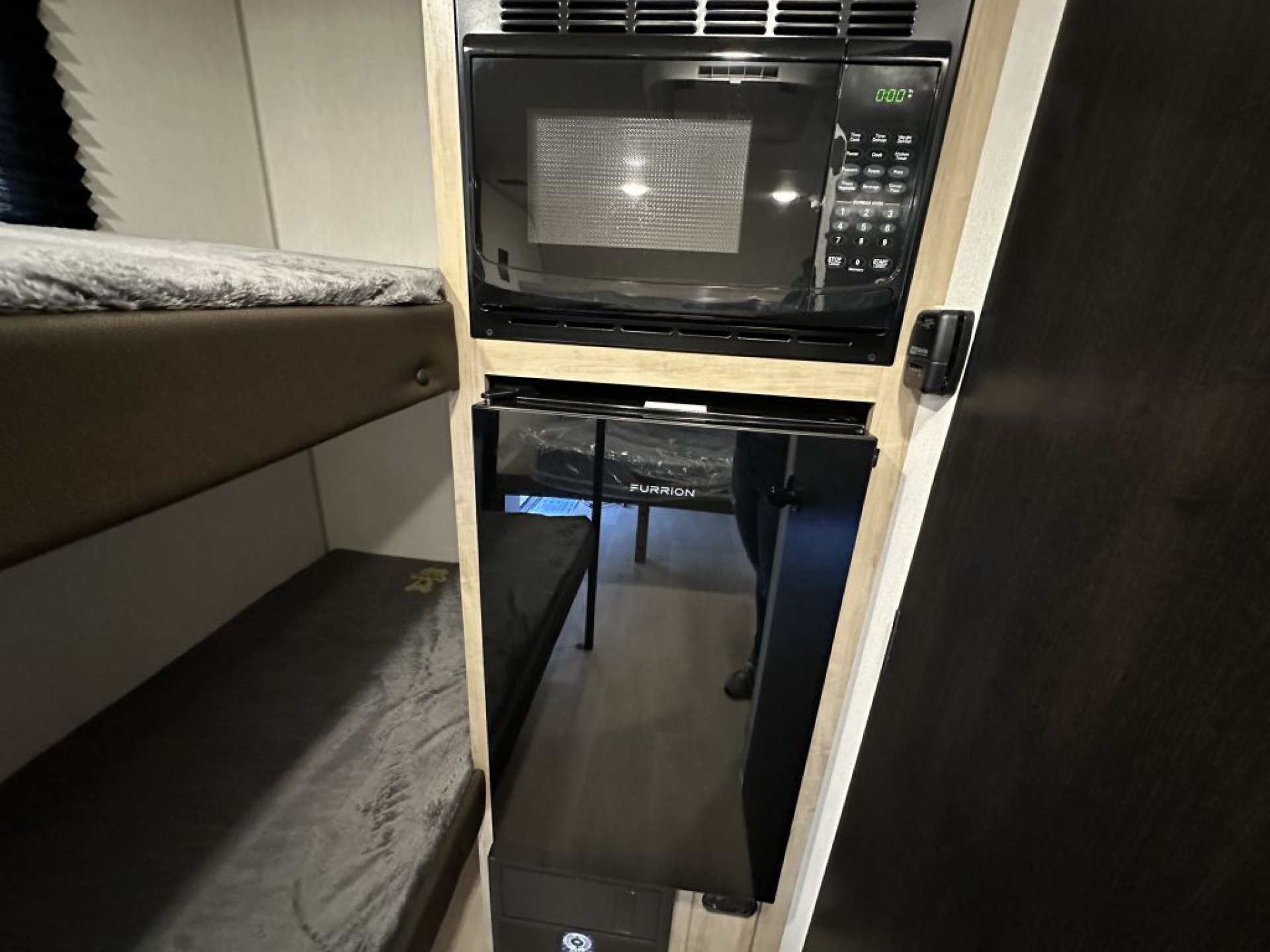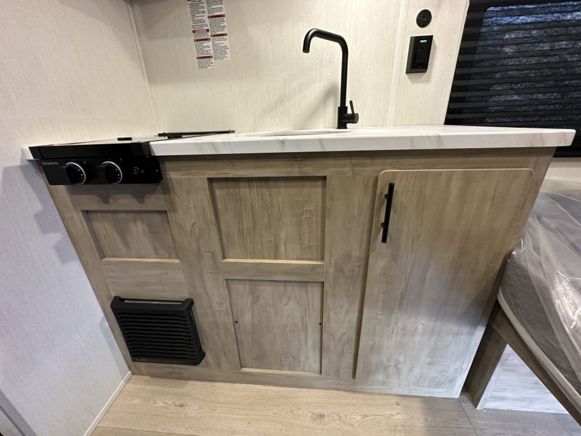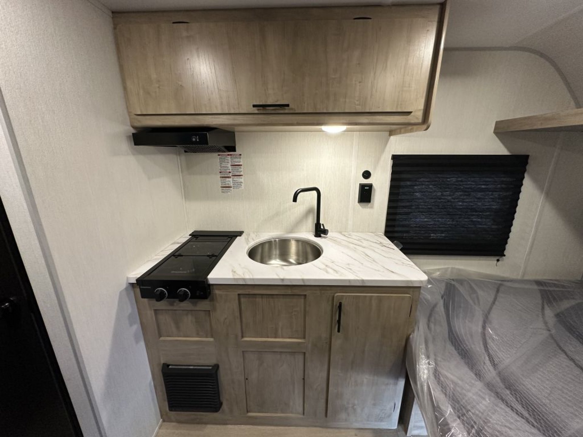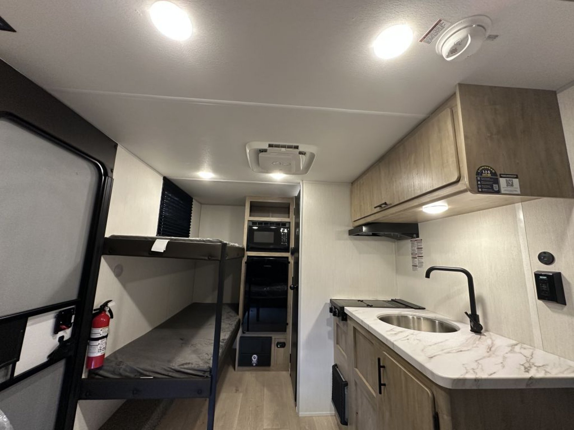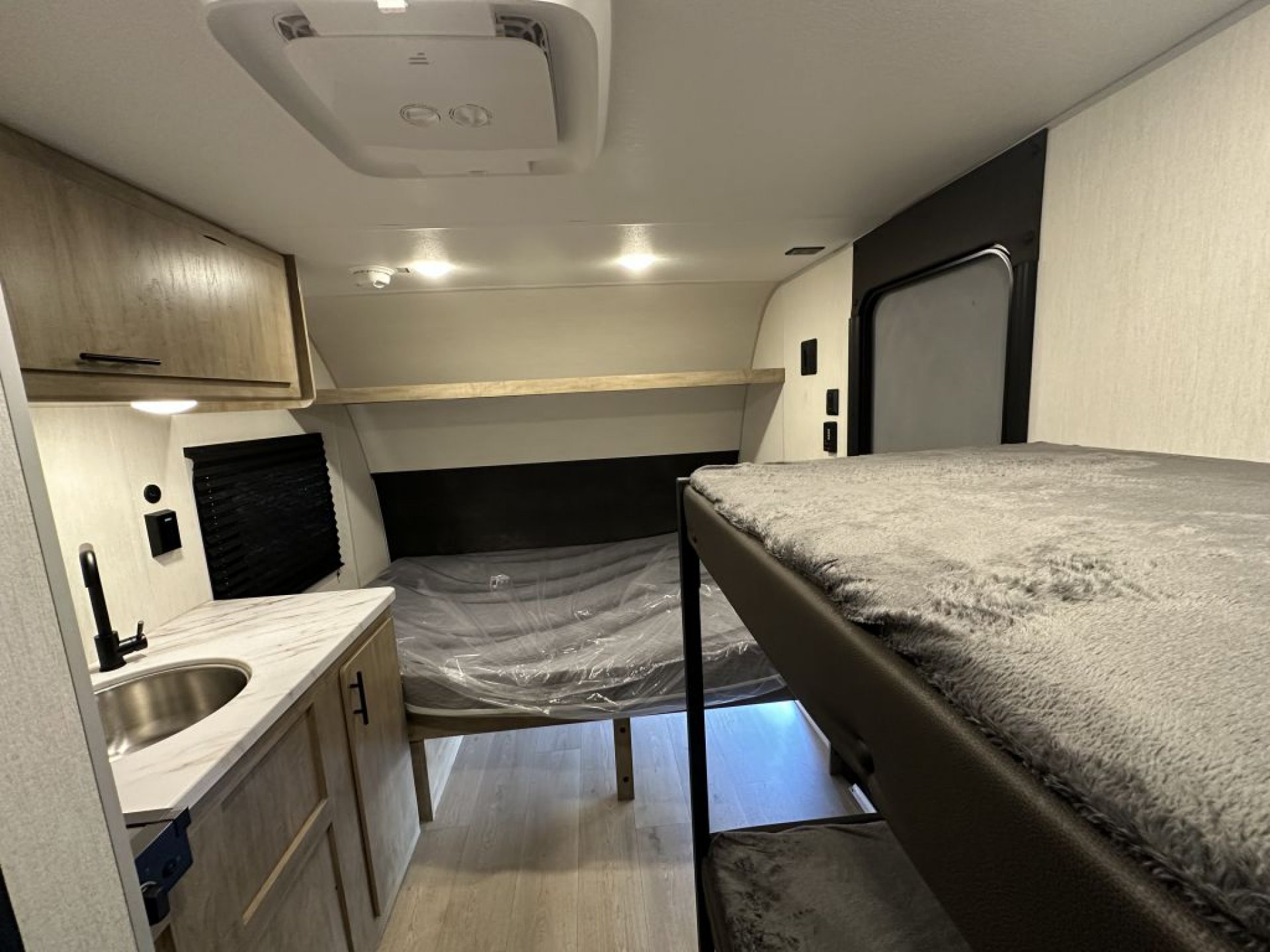 At just over 2,635 pounds empty, the Wolf Pup is easily towable by many midsize SUVs and light trucks. Inside, the thoughtful floorplan provides a comfortable sleeping arrangement with rear bunks, a convertible dinette, and a well-appointed kitchen area. Features such as seamless countertops, residential cabinet hardware, a two-burner cooktop, and a spacious refrigerator make meal preparation simple and convenient.